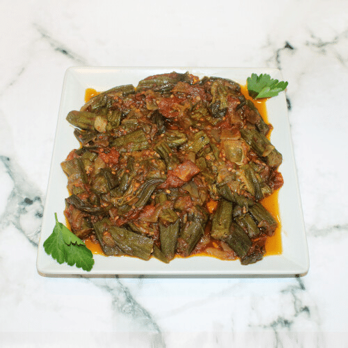 Okraschoten mit Tomaten-Zwiebel-Knoblauchsauce und afghanischen Gewürzen, dazu Brot